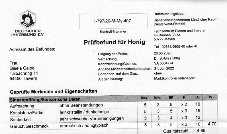 Im Jahr 2020 wurde eine Probe unseres Honigs zur Prüfung angefordert und das Ergebnis hat uns sehr gefreut: